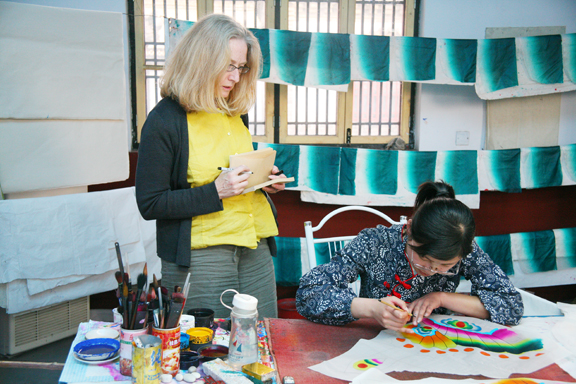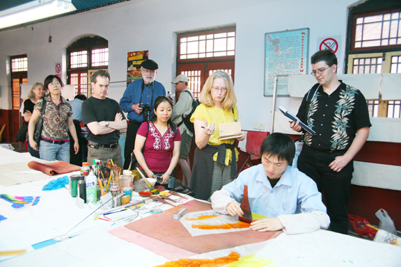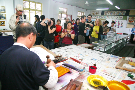 在杨家埠,副所长赵屹带领美国项目组成员考察了“杨家埠民间艺术大观园”,并重点走访了相关年画、风筝艺人,考察了杨家埠木版年画及风筝的制作工艺、传统艺术作品与艺术风格等。考察团对于杨家埠木版年画、风筝这两种民间传统手工技艺表现出浓厚的兴趣。她们表示:山东是传统民间手工艺资源极为丰富的地区,我们要将此次考察的内容拍摄制作成视频短片,放到“中国藤”网站上,更好地宣传中国传统文化与优秀的民族民间文化遗产。