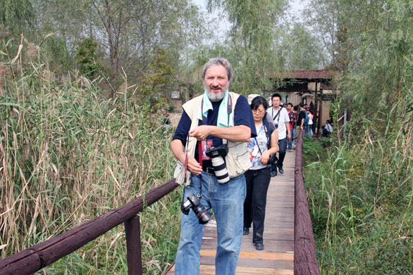 随后,摄影家们还来到了位于湖内的盘龙岛,在岛上参观了乾隆问诊处、《铁道游击队》拍摄基地等景观。岛上悠长狭窄的木桥及桥两边高过人头的芦苇也吸引了不少镜头。