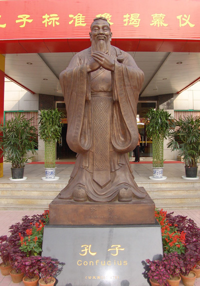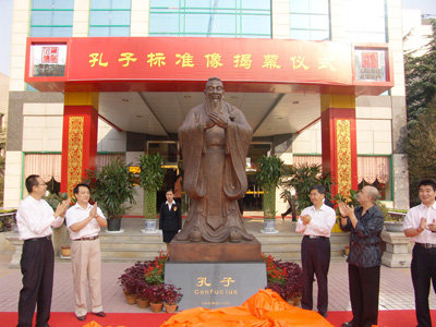 历时9个多月,备受世人关注的孔子标准像,在孔子诞辰2557年祭孔大典的前夕,于孔子故里曲阜揭幕。最终定稿的孔子标准像为255.7厘米的青铜圆雕。中共山东省委宣传部副部长徐向红,中国孔子基金会副理事长兼秘书长张树骅,山东省工艺美术学院院长