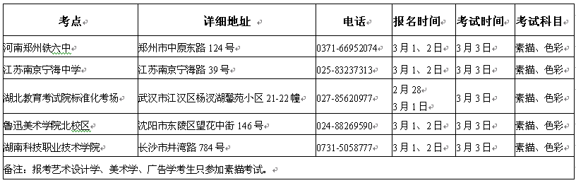2、考点设五个:南京宁海中学、河南郑州铁六中、湖北教育考试院、鲁迅美术学院北校区、湖南科技职业技术学院。