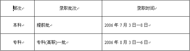 根据山东省招生委员会关于《山东省2006年普通高等学校招生录取工作意见》(鲁招委[2006]9号)中对山东省普通高校录取时间的安排,我校今年本、专科录取时间见下表: