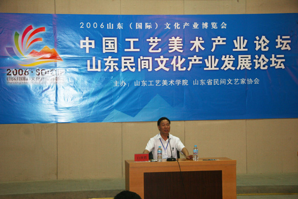 6月16日下午,2006山东国际文化产业博览会主要内容之一,中国工艺美术产业论坛暨山东民间文化产业发展论坛在我校学术报告厅拉开帷幕,中央民族大学博士、日本筑波大学博士、北京师范大学博士后、中国民间文艺家协会分党组书记、常务副主席白庚胜,中央美术学院设计学院副院长许平应邀主讲。山东省文联副主席、山东省民间文艺家协会主席李传瑞,山东省民间文艺家协会副主席王映雪,我校领导