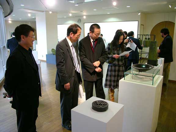 会谈结束后,我妻委员长和蒿谷教授,阿部教授,田中副教授,坂本主任,荒木主查,薮教授等陪同代表团参观了教育学部设计艺术学和美术学专门的教室、工作室、实验室和研究生、本科生的作业和设计作品,同时还参观了学校图书馆`和教育学部艺术设计学师生金属工艺美术展览。