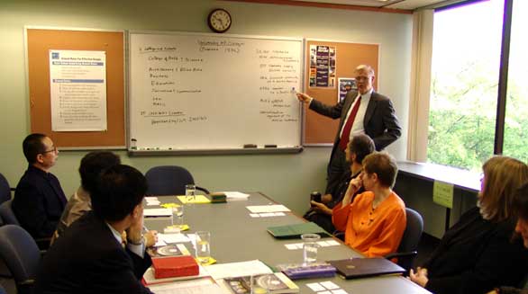 院长一行在负责国际事务的副校长汤姆·米尔兹的陪同下参观俄勒冈大学国际处的各个部门,并听取了他们的情况介绍。俄勒冈大学是美国一所研究型大学,建于1914年。目前俄勒冈大学设有7个学院,25个学术研究机构。有20000名学生,其中15000人是本科生,其余的是硕士生和博士生。学生中包括1500名外国学生,其中中国学生200人。每年,俄勒冈大学还向海外派出800名学生。俄勒冈大学是北美大学联盟成员,太平洋地区大学联盟成员。俄勒冈大学非常重视国际性的学术交流活动,近年来尤其重视与中国大学的合作与交流,旨在形成该校在中国文化交流与研究方面的学术地位。