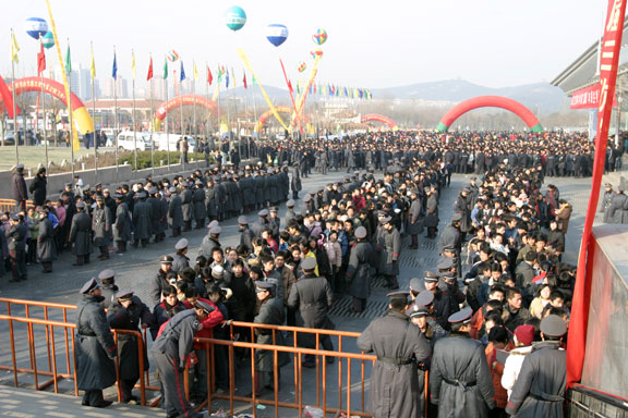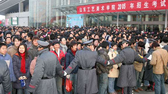 笔者在报名现场看到,舜耕国际会展中心大厅内外挤满了前来报名的考生及家长。展览大厅外,在数百名民警和保安的协调下,报名考生及家长排起了长长的队伍,按序入场。