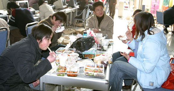 时至中午,报名现场考生流量仍然很大,招生工作人员本着“以考生为本,为考生服务”的宗旨,推迟了午饭的时间,继续接待考生报名。直至下午一点多钟,报名人数才略有减少,在不中断考生报名的前提下,工作人员分批陆续进餐。