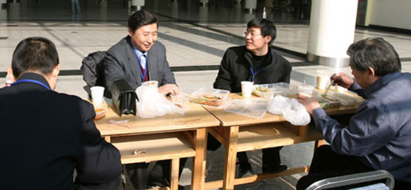 、郭兆志、刁在祥、张云龙等院领导在报名现场与工作人员一起共进工作餐。