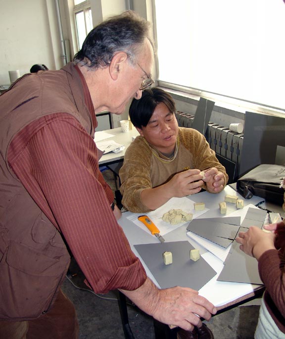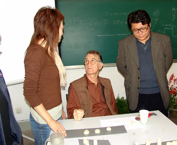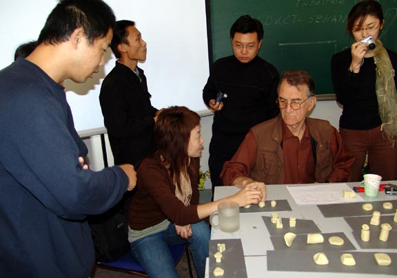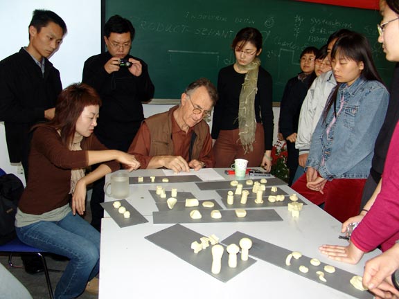 上午,雷曼教授对11月8日与11月9日两天学员们Exercise A的设计作品进行了集体演示性讲评。随后,雷曼教授开始布置Exercise B,在这个练习中,要求学员用橡皮泥设计制作“同系列按钮”,分别完成提(Pull)、按(Push)和旋转(Turn)三种功能的形态设计。雷曼教授重点强调,学员在设计过程中一定要注意同一系列中的每一个按钮功能的语义要清晰,简洁明了。学员们在雷曼教授的精心指导下,从各种角度构思设计了几组不同的橡皮泥按钮模型。在一天的教学过程中,雷曼教授两次对学员的作品进行了集体讲评和多次个别辅导、演示。