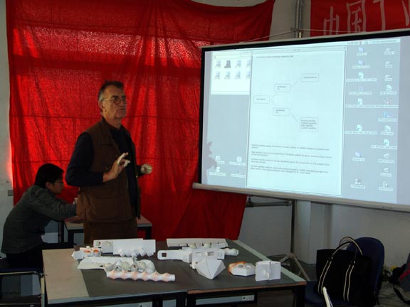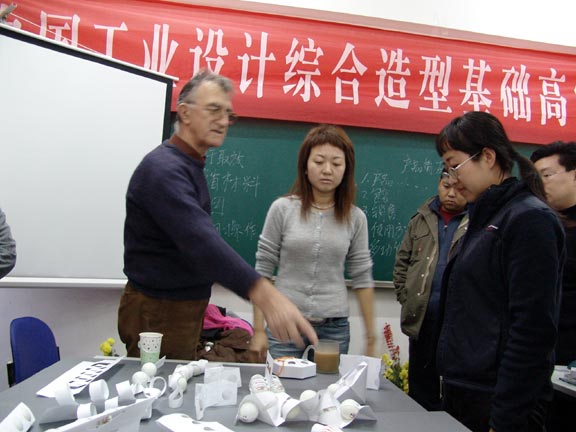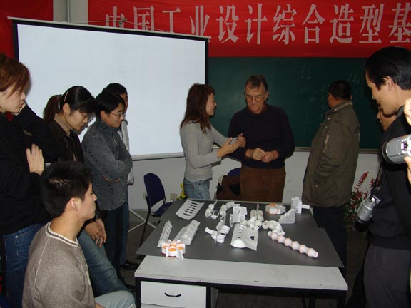 11月12日上午8:00,中国工业设计造型基础高级研修班进行到最后一天的教学进程。上午,雷曼教授对昨天布置的Exercise C(六个乒乓球的礼品包装)进行全班集体性演示讲评。他首先指出这次练习的评价标准,然后逐一点评学员的设计作品。