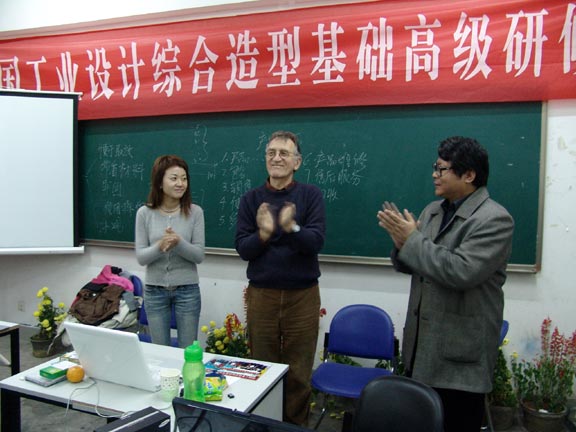 下午14:00,雷曼教授对这一周以来的练习情况进行总结、演示、讲评。随后,他从理论上为学员介绍了一个好的工业产品所具备的特点-首先必须从实用性和功能性上着手,然后注重设计的外观(比如如何处理好形态、色彩、包装等之间的各种关系)。他说,一般而言处理功能和外观的关系时各占60%和40%。另外,雷曼教授还向学员介绍了产品设计的整个过程(程序)并就现代工业设计教学中大家关心的问题回答了学员的提问。
