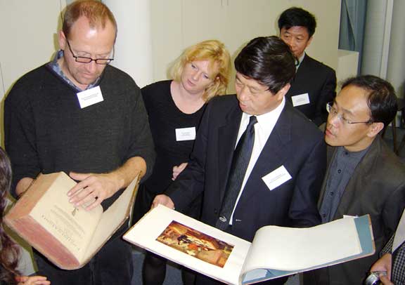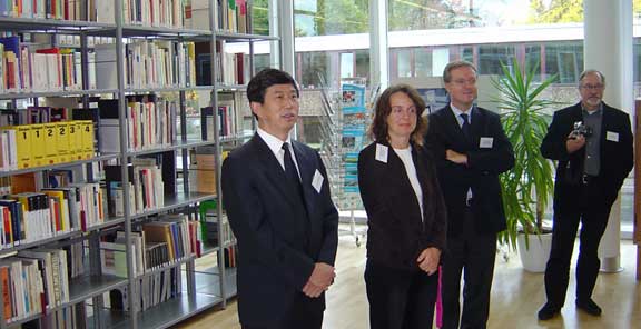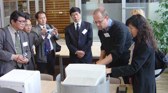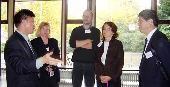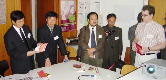 会谈结束后,比勒菲尔德大学系部负责人带领考察组织成员分别参观了学生作业作品展览、学生考试作品展览,以及印刷工作室(包括电子印刷、丝网印刷等)、服装设计(手绘表现)工作室、服装CAD工作室、服装面料工作室、油画工作室、摄影工作室、媒体设计工作室、图书馆等。参观了服装设计专业项目教学的基本过程,当场与教师和学生进行了交流,了解项目(主题)教学的理念和方法,学生当场讲述了自己通过项目教学进行学习的过程。在参观媒体设计工作室时,Andreas Beaugrand博士以一DVD项目设计的整个过程、内容,以及涉及的学科知识为例,向考察组成员详细介绍了项目教学的基本方法过程。