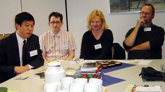 比勒菲尔德大学设计学院7名不同专业的教授与考察组成员进行了广泛交流。他们首先介绍了比勒菲尔德大学,以及设计学院的主要专业情况。该大学共计有学生6000余人,分布于比勒菲尔德大学7个教学区。设计学院有学生约650人,有平面设计、服装设计和摄影与媒体设计三个专业。学制四年,毕业授予硕士学位。学分制教学,每个学生必须完成注册专业规定的5-10门必修课程,毕业论文主题必须与所注册专业相关,否则不予毕业。选修课程则不受注册专业限制,完全根据自己的兴趣、爱好和专业需求,自己制定课程计划进行课程选择。理论课和文化课在教学中占有重要位置,包括艺术史、文化史、社会科学等内容。专业理论强调知识、设计形式以及设计功能等方面的研究。以杯子设计为例,其理论包括杯子的历史、杯子的发展趋势、杯子的造型演变、杯子的发展趋势、杯子与生活方式,为杯子设计的创新与实践打下基础。在教学中,注重项目教学的作用与实施。除了专业基础课程外,专业课程围绕项目教学进行。以媒体设计教学为例,一个主题的DVD光盘设计包括:界面设计、说明书设计、封面设计、包装设计等,界面设计是重点,课题的完成设计艺术、文化、科学技术等多种专业知识。考试方式一般是:学生与上课教师预约—教师同意考试—学生完成考试—学生对自己设计进行公开展示接受公众评判—教师评定。