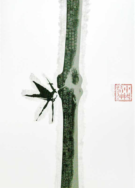 作品《中国精神》选择竹子为视觉元素,来象征中华民族的民族气节和情操。将竹竿用骨头加以替换,使柱子的象征意义得到强化,更视觉化。黑白的色彩与图章转达了民族风格特色。竹子 “宁折不弯”、“虚心向上”、“百尺竿头”、“清气昂然”。她也被用以象征中华民族的民族气节和情操。