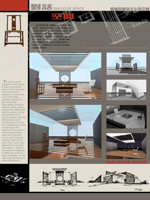 《对话空间》的作者丁宁教授曾就这件作品进行了进一步的阐释,他说:“《对话空间》是一件概念性的设计作品,它通过透明的玻璃界面与四扇虚实相间的屏风墙,构成了一个虚拟而纯粹的空间。空间中的明式椅与巴塞罗那椅在寂静中相对而立……该作品的设计观念在于:以象征性的空间形象营造一种氛围,通过具有文化符号象征意义的两种不同风格椅子的对话,引发人们对东西方文化不同的哲学观、美学观、价值观等方面的联想与思考。”