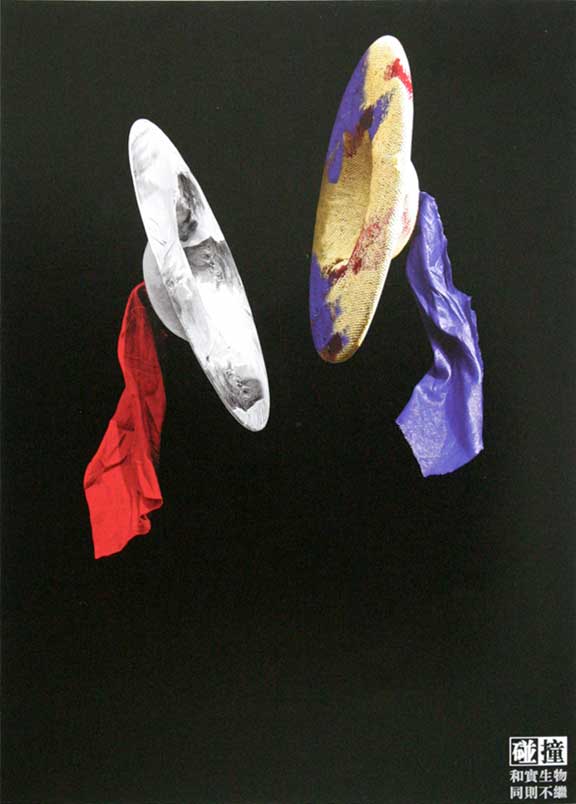 作品《碰撞》以宣纸渲染水墨和亚麻布涂油彩包裹铜镲,穗头分别用红蓝两色,实物拍摄而成;以黑色为背景突出主体,力求简洁明快。一对铜镲分别象征东西方不同的绘画形式,即文化艺术,二者相互撞击,有形又如闻声,寓意文化的对撞,即宣扬文化“和实生物,同则不继”之意。