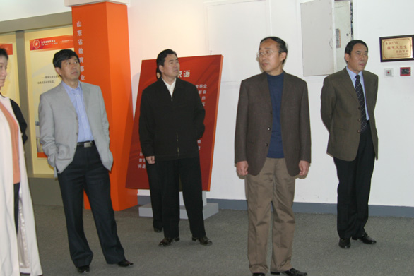 由中共山东省委高校工委、省教育厅主办,我院承办的山东教育事业“十五”成就暨“十一五”规划展将于11月26日在山东省博物馆拉开帷幕。25日下午,省委高校工委、省教育厅厅长齐涛在我院党委书记于茂阳、副院长李新、刁在祥的陪同下视察了展览准备情况,听取了组委会撰写的展览解说词,并对解说词提出了修改意见。齐涛厅长对我院的展览准备工作表示满意。