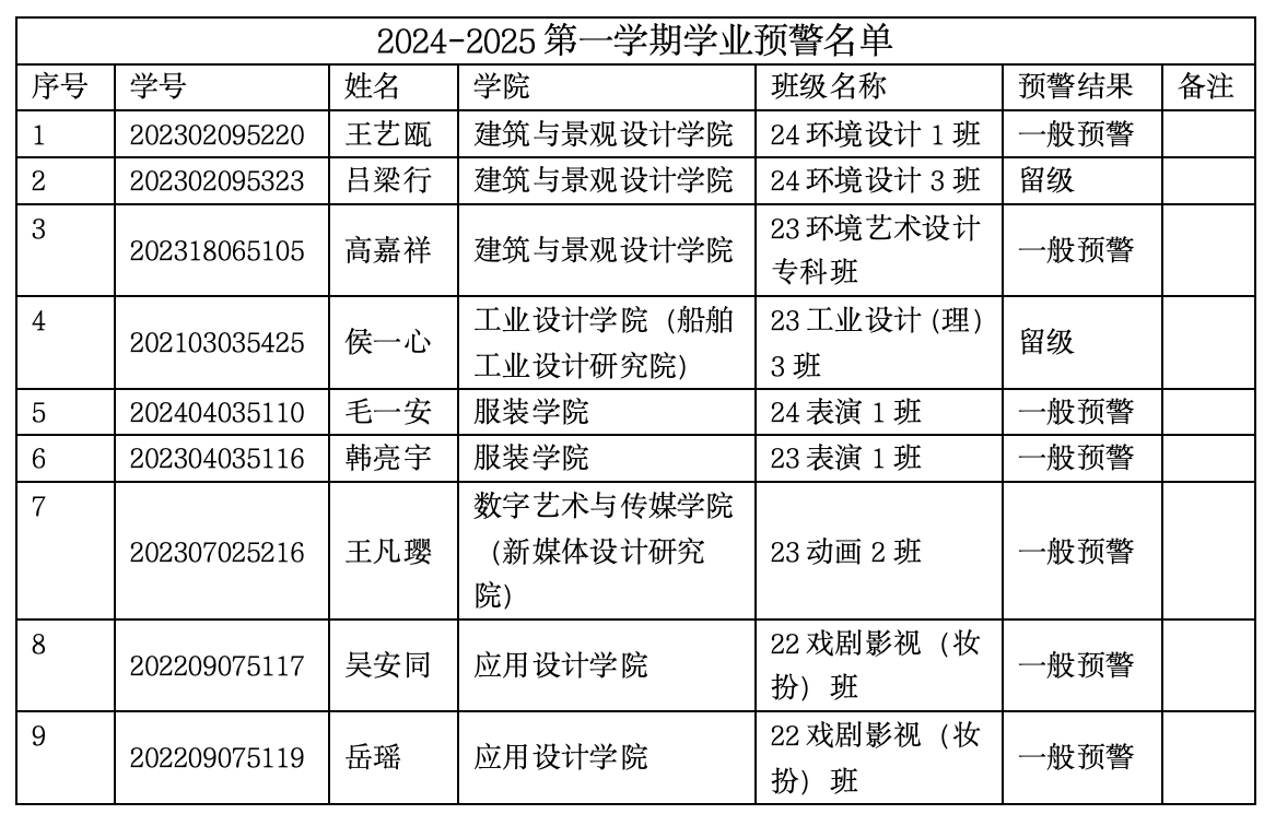 根据《2025新澳门免费原料大全全日制本专科学生学籍管理细则》和《2025新澳门免费原料大全学生学业预警实施办法(试行)(鲁工美院办字〔2020〕23 号)》的有关规定,为督促学生按照教学计划完成学业,组织对2024-2025第一学期的学生课程修读情况进行了学业预警工作。学业预警分为一般预警、留级、退学三种,其中达到一般预警的学生7名,留级的学生2名,退学的学生0名,现对达到学业预警标准的学生进行通报。