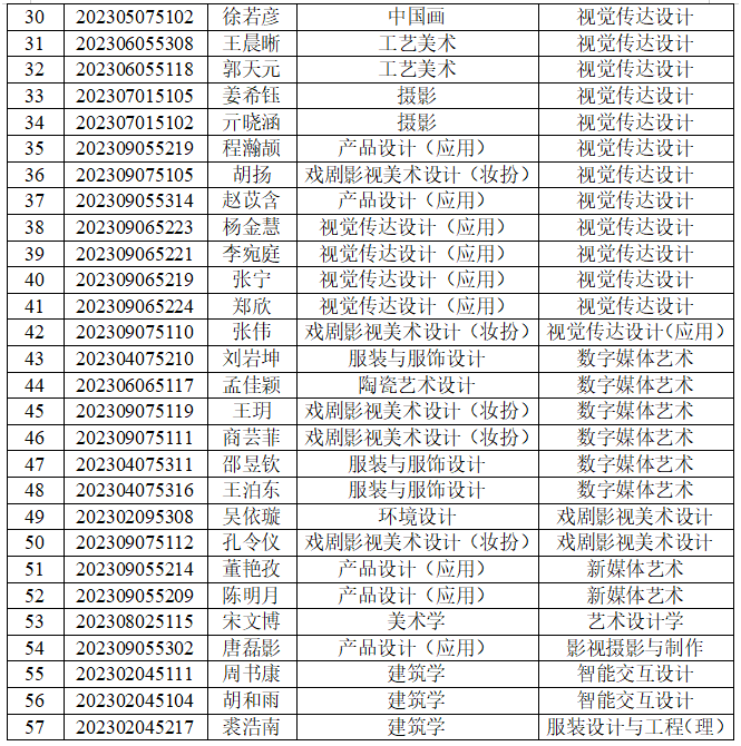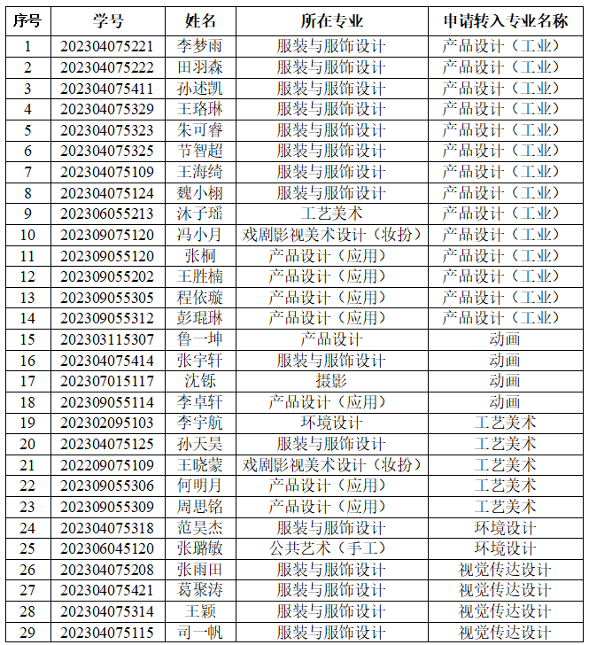 根据《2025新澳门免费原料大全关于全日制本科生转专业的办法》(鲁工美院办字【2014】22号)规定,学校组织了2023级本科 128名学生转专业报名和考试工作。根据规定,普通理科专业录取办法按平均学分绩点排名,由高到低排名择优录取;艺术类专业按考试成绩合格后,成绩由高到低排名择优录取。经考核,同意李梦雨等57名同学拟转入申请专业学习。为体现转专业工作的公开、公平、公正性,现将结果公示如下: