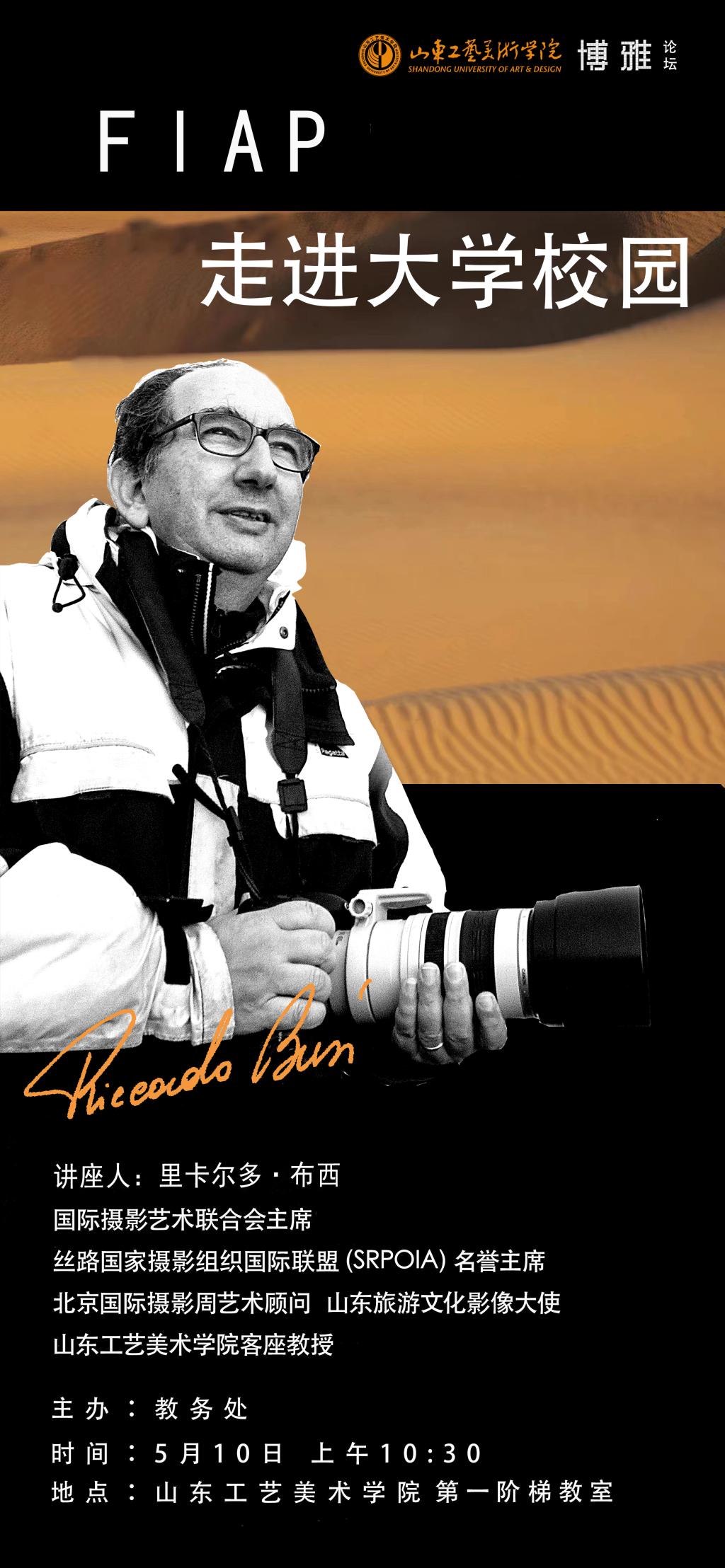 5月10日,教务处举办博雅论坛系列活动,由世界著名摄影大师、国际摄影艺术联合会主席里卡尔多·布西带来题为《FlAP走进大学校园》的精彩讲座,教务处处长顾群业主持本次讲座活动,摄影艺术、视觉设计、数字艺术等多领域专业学生积极报名参加讲座,与世界摄影大师共同探索视觉艺术的多样表达。