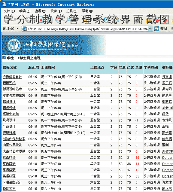 通过新的教学管理系统,我院进行了05-06学年第一学期跨专业选修课与任意选修课的网上选课,此次开设跨专业选修课36门次,涵盖了除现代手工艺系、服装系外其它各系的主要专业的骨干课程,开出了标志设计、招贴设计、景观设计、产品设计、卡通造型设计、摄影艺术、影视视听艺术、国画创作、油画作品欣赏、考古与文物鉴赏等跨专业课选修课及现当代艺术思潮、传播学概论、英语口语、社会学概论等任意选修课,学生选课积极踊跃,仅校本部02、03级及应用技术学院04级学生近2500人次选课。