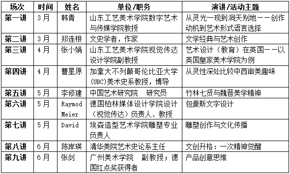 为活跃校园文化氛围,增强学术讲座的主题性和连贯性,本学期教务处继续推出“主题性+系列化”相结合的套餐式讲座形式,让更多学生能围绕主题进行更宽泛的选择。本学期“博雅论坛”系列文化学术讲座以“设计、艺术的创作与审美过程”作为主题,针对学生在专业学习、设计创作与研究、综合素质等方面的问题,邀请在某一领域学有专长的专家、教授来我校做专题讲座,以达到开阔学生视野、突出实践应用、丰富学生文化生活之目的。具体安排如下:
