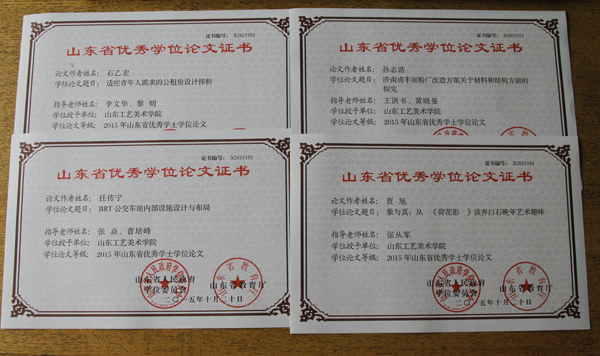 近日,接山东省人民政府和山东省教育厅通知,我校有四篇学士学位论文获2015年山东省优秀学士学位论文称号,他们是:孙志浩同学的《济南成丰面粉厂改造方案——关于材料和结构方面的探究》,指导老师:王洪书、黄晓曼;石乙宏同学的《适应青年人需求的公租房设计探析》,指导老师:李文华、黎明;任传宁同学的《BRT公交车站内部设施设计与布局》,指导老师:张焱、曹培峰;贾旭同学的《象与真:从〈荷花影〉谈齐白石晚年艺术趣味》,指导老师:张从军。