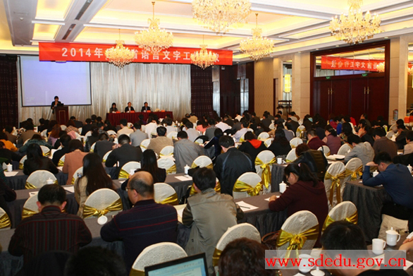 郭建磊在讲话中总结了2013年我省语言文字工作,安排了今年的任务。他指出,全省语言文字工作系统要以十八届三中全会精神为指导,深刻认识当前语言文字工作面临的新形势,进一步明确语言文字事业改革发展的目标任务,扎实做好今年的各项工作任务,进一步推进我省语言文字事业的改革发展。他强调, 2014年要重点做好四方面工作:一是深入贯彻《国家中长期语言文字事业改革和发展规划纲要》和《山东省实施意见》,各地、各高校制定本地、本校的落实措施。二是继续推进数据库建设工程,争取完成29个调查点的调查工作。三是加大城市语言文字评估工作推进力度,年内完成二类城市评估任务,促进三类城市评估取得重要进展。四是提高公民语言文字应用能力,传承弘扬中华优秀文化。五是继续做好语言文字机构和队伍建设、国家通用语言文字推广推行、提高学校语言文字规范化水平、语言文字科学研究等常规工作。