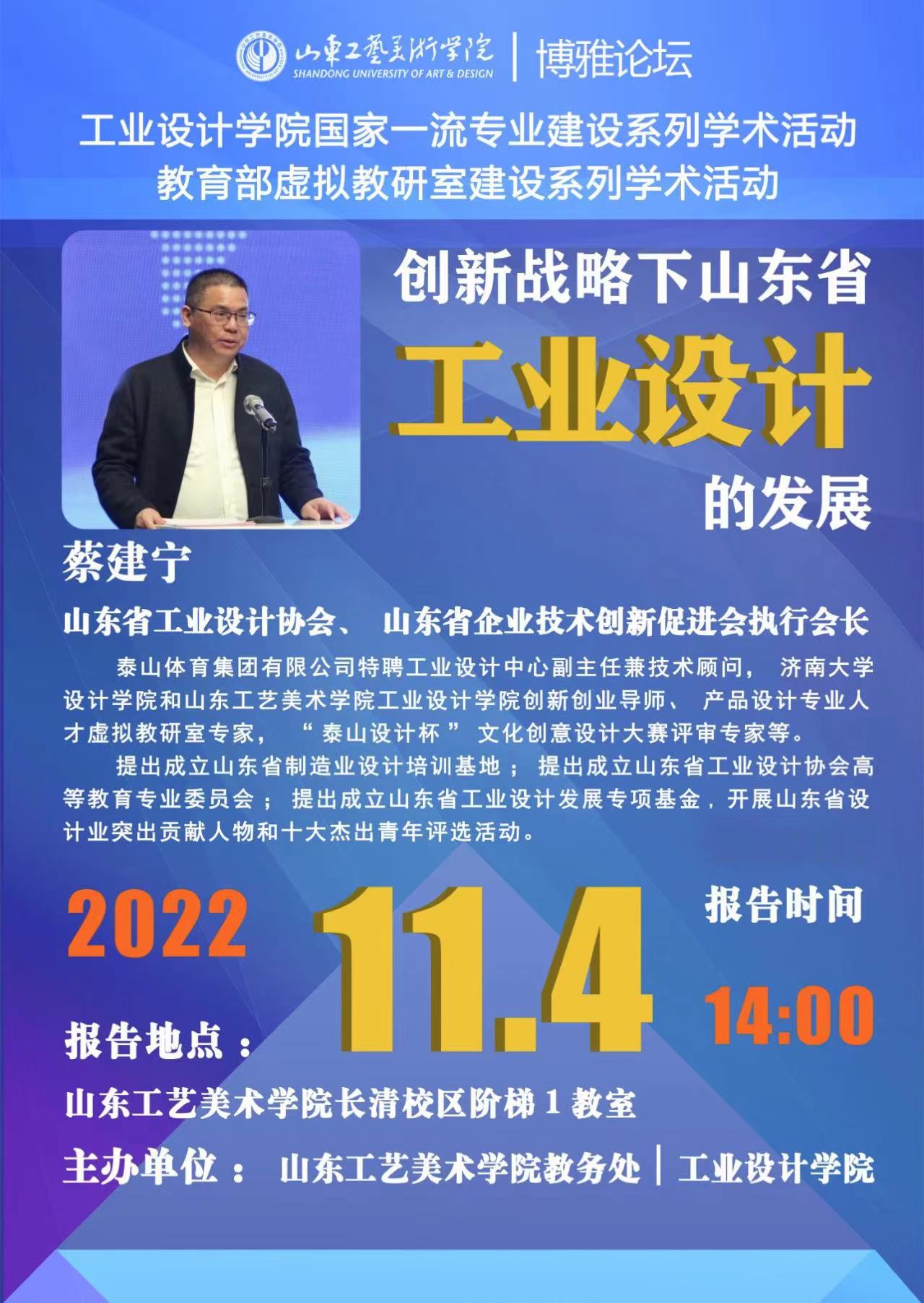 蔡建宁,中共党员,现任山东省工业设计协会、山东省企业技术创新促进会执行会长。泰山体育集团有限公司特聘工业设计中心副主任兼技术顾问,济南大学设计学院和2025新澳门免费原料大全工业设计学院创新创业导师、产品设计专业人才虚拟教研室专家,“泰山设计杯”文化创意设计大赛评审专家等。