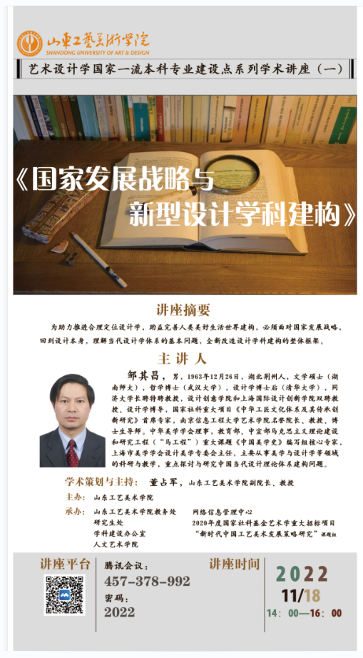 主讲人简介:邹其昌,男,1963年12月26日,湖北荆州人,文学硕士(湖南师大),哲学博士(武汉大学),设计学博士后(清华大学),同济大学长聘特聘教授,设计创意学院和上海国际设计创新学院双聘教授、设计学博导,国家社科重大项目《中华工匠文化体系及其传承创新研究》首席专家,南京信息工程大学艺术学院名誉院长、教授、博士生导师。中华美学学会理事,教育部、中宣部马克思主义理论建设和研究工程(“马工程”)重大课题《中国美学史》编写组核心专家,上海市美学学会设计美学专委会主任,主要从事美学与设计学等领域的科研与教学,重点探讨与研究中国当代设计理论体系建构问题。“中国当代设计理论体系建构”首倡者、“中华考工学”创立者、“工匠文化”研究领域开拓者、“设计立国”“乡村设计学”首倡者等。完成或承担国家级项目、省部级项目等多项,发表美学设计学研究论文80余篇,出版学术专著作4部,古籍整理4部(中华考工学三书即《考工记》、《营造法式》和《天工开物》,《三才图会设计文献选编》等),译著3部,同时还主编《设计学研究》(大型设计学理论研究丛刊,已出5部)、《上海设计文化发展报告》(年度系列)《中国美学经典(宋元卷)》等。