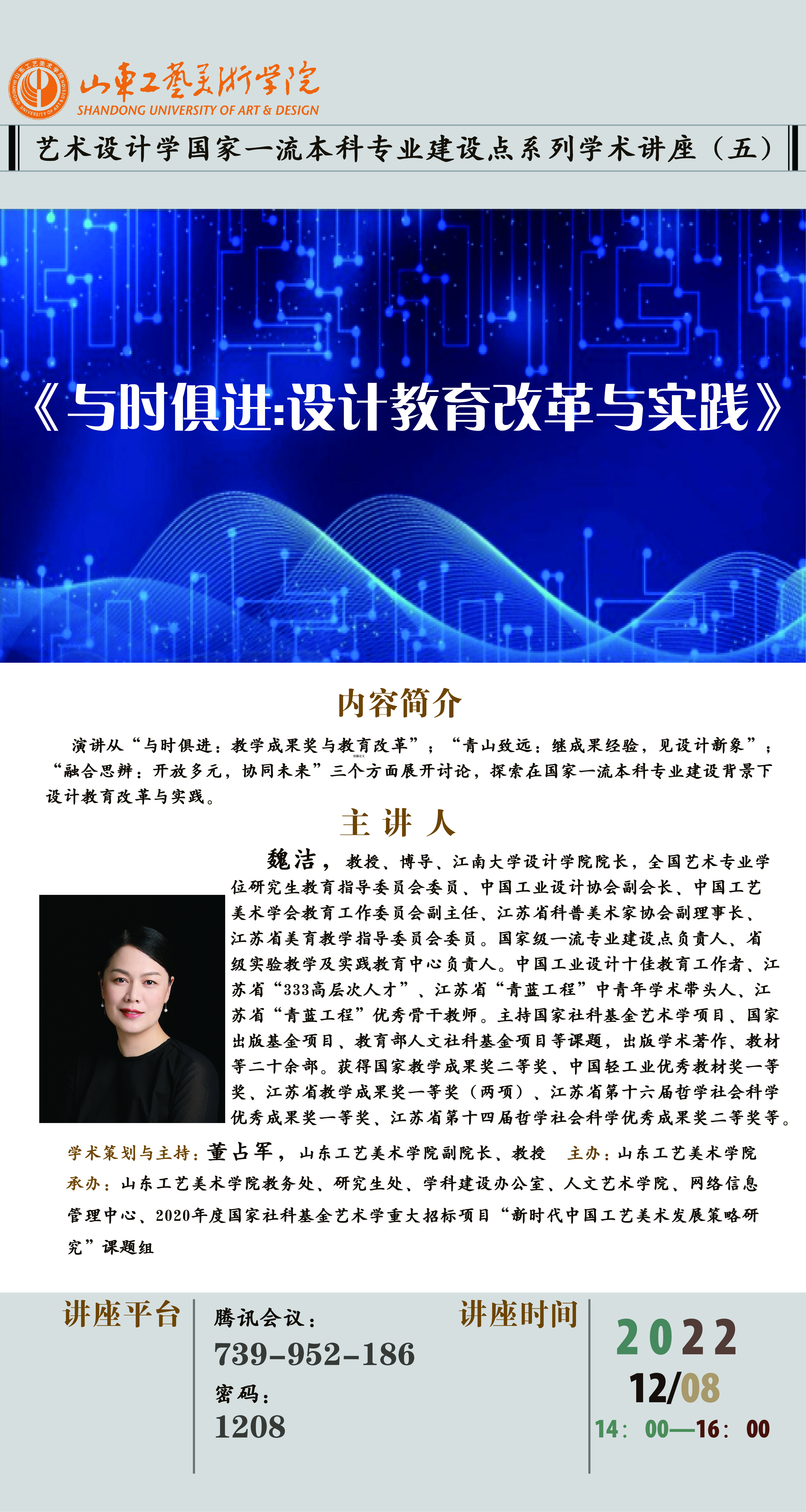 主讲人简介:魏洁,教授、博导、江南大学设计学院院长,全国艺术专业学位研究生教育指导委员会委员、中国工业设计协会副会长、中国工艺美术学会教育工作委员会副主任、江苏省科普美术家协会副理事长、江苏省美育教学指导委员会委员。国家级一流专业建设点负责人、省级实验教学及实践教育中心负责人。中国工业设计十佳教育工作者、江苏省“333高层次人才”、江苏省“青蓝工程”中青年学术带头人、江苏省“青蓝工程”优秀骨干教师。主持国家社科基金艺术学项目、国家出版基金项目、教育部人文社科基金项目等课题,出版学术著作、教材等二十余部。获得国家教学成果奖二等奖、中国轻工业优秀教材奖一等奖、江苏省教学成果奖一等奖(两项)、江苏省第十六届哲学社会科学优秀成果奖一等奖、江苏省第十四届哲学社会科学优秀成果奖二等奖等。