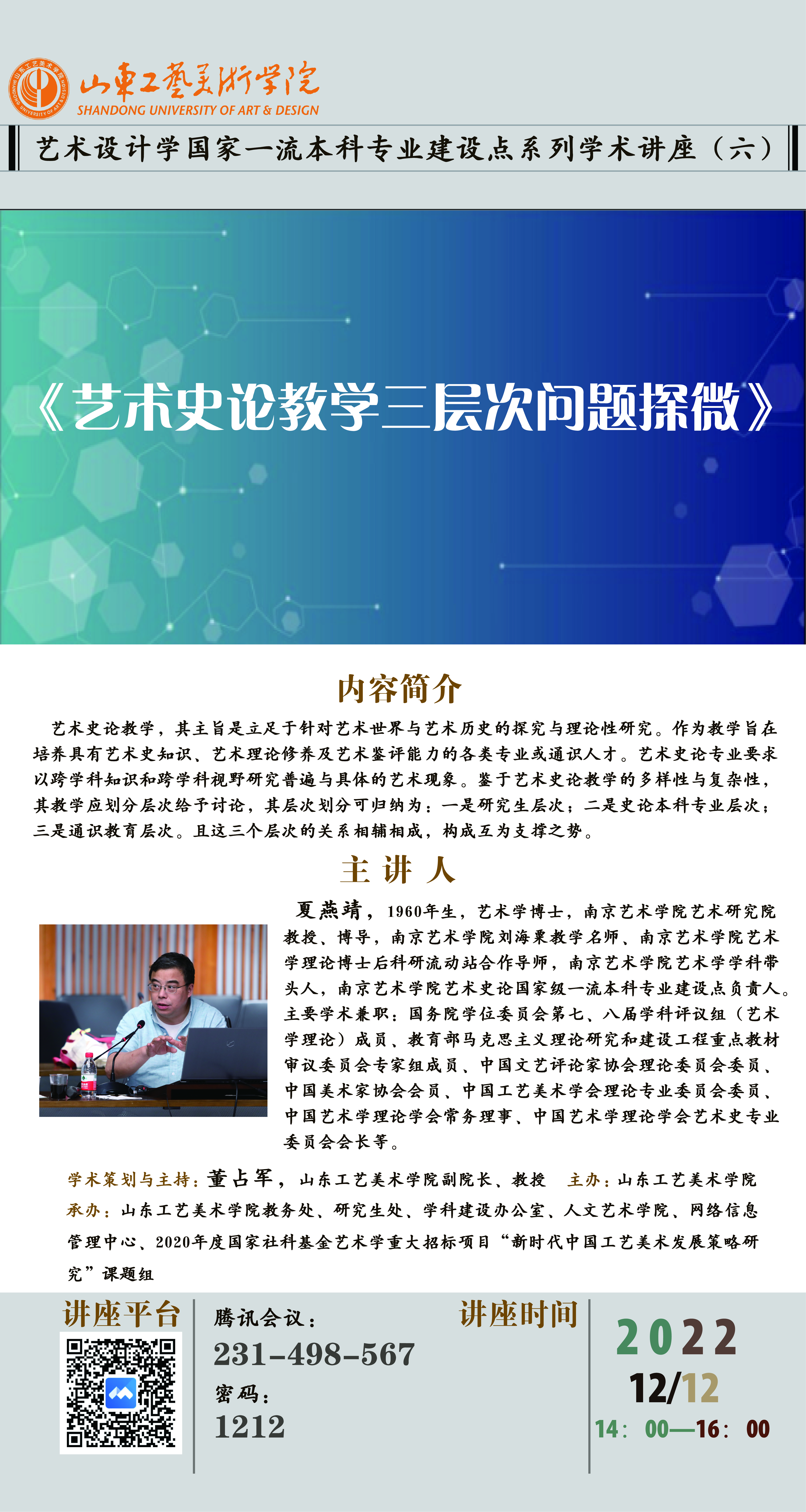 主讲人简介:夏燕靖,1960年生,艺术学博士,南京艺术学院艺术研究院教授、博导,南京艺术学院刘海粟教学名师、南京艺术学院艺术学理论博士后科研流动站合作导师,南京艺术学院艺术学学科带头人,南京艺术学院艺术史论国家级一流本科专业建设点负责人。