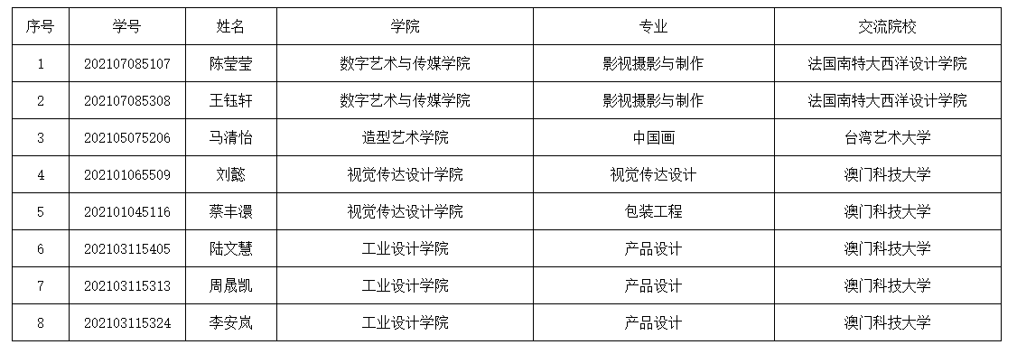 根据《2025新澳门免费原料大全在校生访学、留学管理办法(试行)》规定,按照访学条件对报名学生进行审查,陈莹莹等8名同学符合2024年春季本科生赴国(境)外访学的条件。为体现公开、公平、公正原则,广泛听取大家意见,现将其公示。如有不同意见,请于2023年10月17日前,以电话、传真、信函等形式向国际交流合作处台港澳事务办公室、教务处办公室反映。