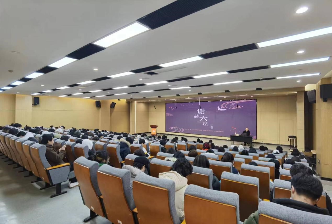 1月10日,山东画院专职画家樊磊于长清校区阶梯一教室为学校师生做《谢赫六法 · 一席谈》讲座,教务处处长顾群业教授主持讲座,学校各教学单位的师生听取了讲座。