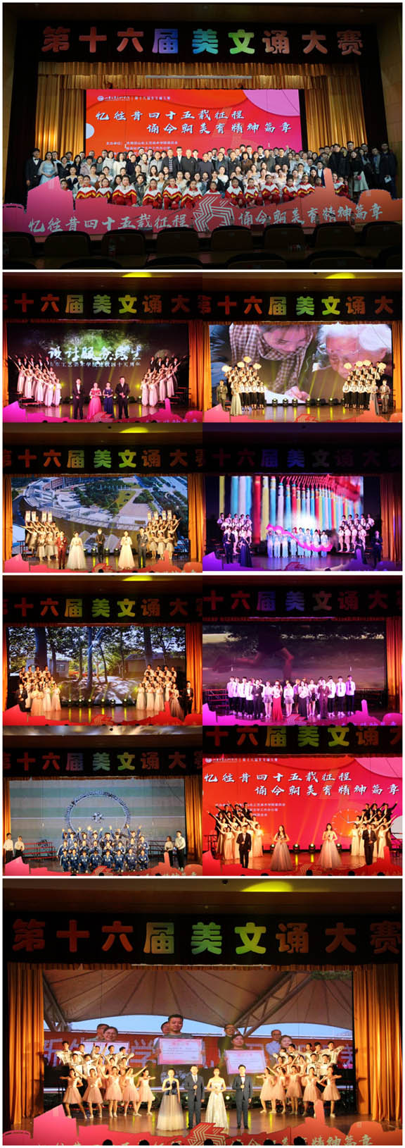比赛中,现代手工艺术学院代表队诵读了《忆往昔,四十五载峥嵘岁月》,他们斗志昂扬,怀揣对未来的憧憬与向往,回顾工美四十五载的辉煌历史;数字艺术与传媒学院代表队诵读了《四十五载我著史,匠心独运我传承》,他们满怀希望,踏着岁月的印记,歌颂母校多年的坚守与匠心;视觉传达设计学院代表队带来了《匠心有影微云外,踏遍千山守月明》,他们用层层递进的情感,描绘出工美欲出红日、缱绻微风的动人画面;服装学院代表队诵读了《绘往昔画卷,绽今朝芳华》,他们胸怀万里世界,放眼无限未来,他们坚信“美育精神”必将长兴;人文艺术学院代表队带来了《赞歌》,他们巧用历史典故,以古鉴今,表达自己永不言弃、不忘初心的誓言;造型艺术学院代表队诵读《以育成之美,美人之美》,他们怀着对家国的赤诚之心,用声情并茂的朗诵表达着山工艺学子对“美育精神”的诠释;应用设计学院代表队诵读了《至美工艺,再谱华章》,他们传递大千世界的绚丽多彩,他们寻找前人的足迹延续今朝;建筑与景观设计学院代表队带来了《浮生过往,又见归来》,他们满怀真挚的感情,生动地表现了即使前路坎坷,依旧坚守初心的精神;工业设计学院代表队诵读了《浅吟四十五载匠心》,他们用满腔的热血和动人的言语,让生命为成长而奋力拼搏。各代表队明确突出的主题表达,生动形象的舞台展现,慷慨激昂的情感流露赢得了场下的阵阵喝彩。