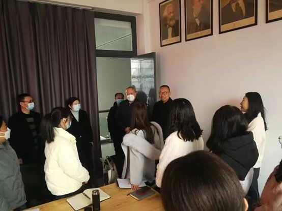 院长潘鲁生,副院长张艳霞,纪委书记苗新民,副院长董占军,副院长韩世春,党委委员、统战部部长孙大刚,党委委员、宣传部部长韩文涛,党委委员、组织部部长许磊莅临检查新学期开学准备工作,潘鲁生在肯定马克思主义学院工作成绩的同时,对马院教师提出了三点要求,一是要深入学习贯彻研究党的二十大精神,持续推进党的二十大精神“进课堂、进教材、进头脑”,把思政课讲深、讲透、讲活,提高学生的抬头率和点头率。二是教学研究要与学校的专业相结合,与文艺理论、“两创”思想深度融合,推进“思政+设计”双融共育机制的发展。三是希望青年教师发挥青年人接受事物新、理解能力强、跟进速度快的优势,结合学校专业,发挥自身特长,积极投身教学和科研,努力做出更大成绩。学院全体教师备受鼓舞。