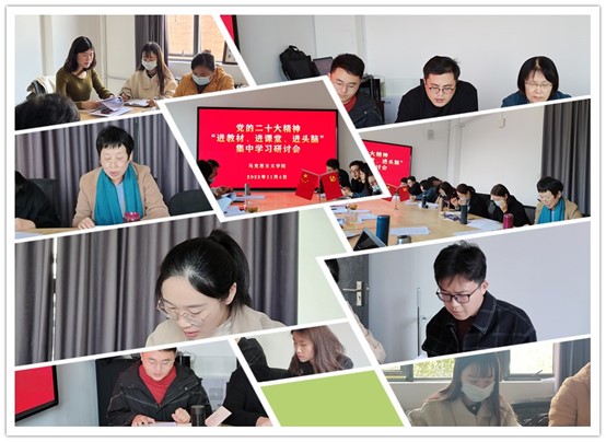 韩文涛作总结讲话。他指出,学习宣传贯彻党的二十大精神是当前和今后一个时期的首要政治任务,马克思主义学院全体教师要充分认识党的二十大的重大意义,把二十大精神转化到教学、科研、学习宣讲上来,努力建设好学习研究宣传马克思主义的主阵地。他就切实推进二十大精神“进教材、进课堂、进头脑”提出具体要求。一是要凝聚共识。党的二十大胜利召开,是我们党政治生活中的一件大事,为新征程上举什么旗、走什么路、以什么样的精神状态、朝着什么样的目标继续前进等重大问题指明了方向。进入新时代,作为思政课教师,要善于把握事物的本质,知其然更知其所以然,积极落实好意识形态责任制。二是要学以致用。马克思主义是我们立党立国、兴党兴国的根本指导思想。在教学科研中,要结合生动、实践案例把思政课“讲准、讲活、讲深、讲透”,提升育人效果,有效引导学生“真学、真懂、真信、真用”;加强理论研究,做好二十大最新理论成果的研究阐释工作,出一批教学科研成果。三是要守正创新。围绕学校中心工作、发挥专业优势,构建“大思政课”格局,把马克思主义基本原理同具体实践相结合、同中华优秀传统文化相结合,打造“实践育人”特色品牌,推动思政小课堂与社会大课堂相结合、推动各类课程与思政课同向同行,教育引导学生坚定“四个自信”,成为堪当民族复兴重任的时代新人。