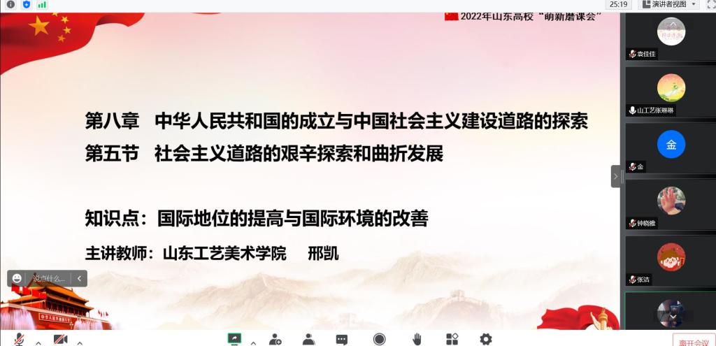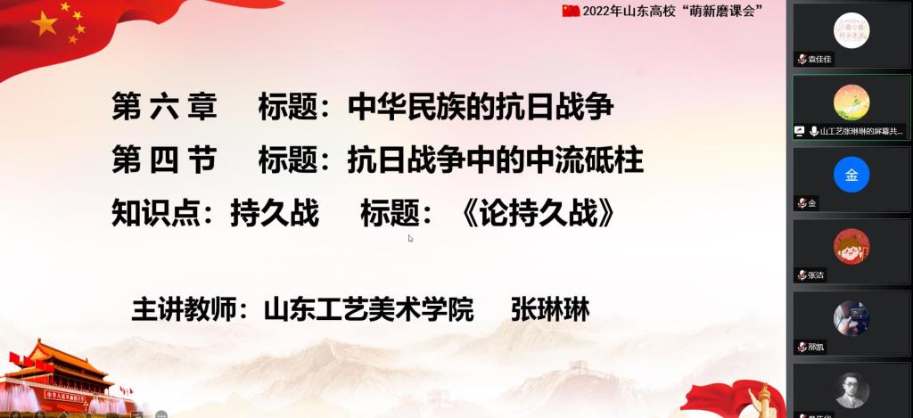 恰逢山东高校思想政治理论课“萌新磨课会”举办之际,为提升我院青年思政课教师的业务能力,增强思政课的思想性、理论性和亲和力、针对性,8月13日上午,学院在线组织了“萌新磨课会”试讲活动。活动由近代史与形势政策教研室主任金文涛主持,邢凯和张琳琳两位老师先后进行试讲,副书记副院长张晓宁、各教研室联系人及近代史与形式政策教研室全体教师参与听课。