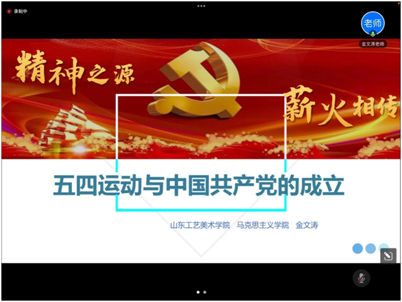 中国近现代史纲要与形势政策教研室的金文涛老师,讲授了“五四运动与中国共产党成立”这一章节的内容。通过翔实的数据资料和丰富的史料文献,向学生们生动再现了五四运动和中国共产党成立的历史图景。结合抗击疫情的真实案例,帮助学生们更好地理解和把握伟大建党精神。