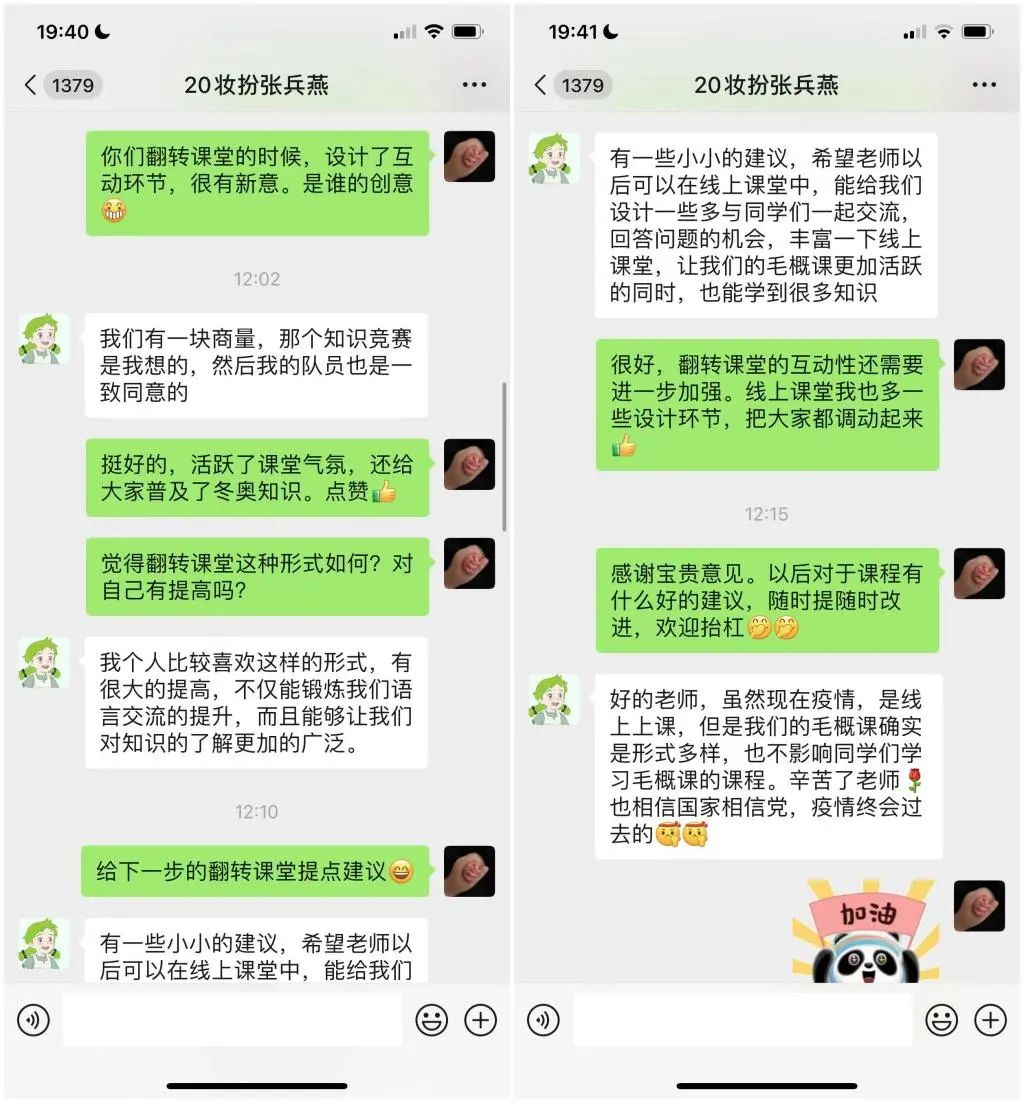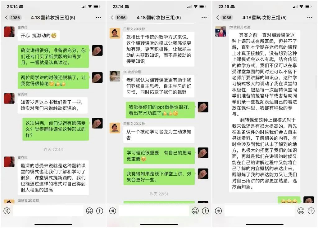 老师们也十分重视学生课后的意见反馈,并结合实际调整完善教学方案。在最近的一次交流中,同学们围绕“如何上好疫情之下有滋有味的‘翻转课’”出谋划策,真正成了优质思政课的“策划人”和“共建者”。