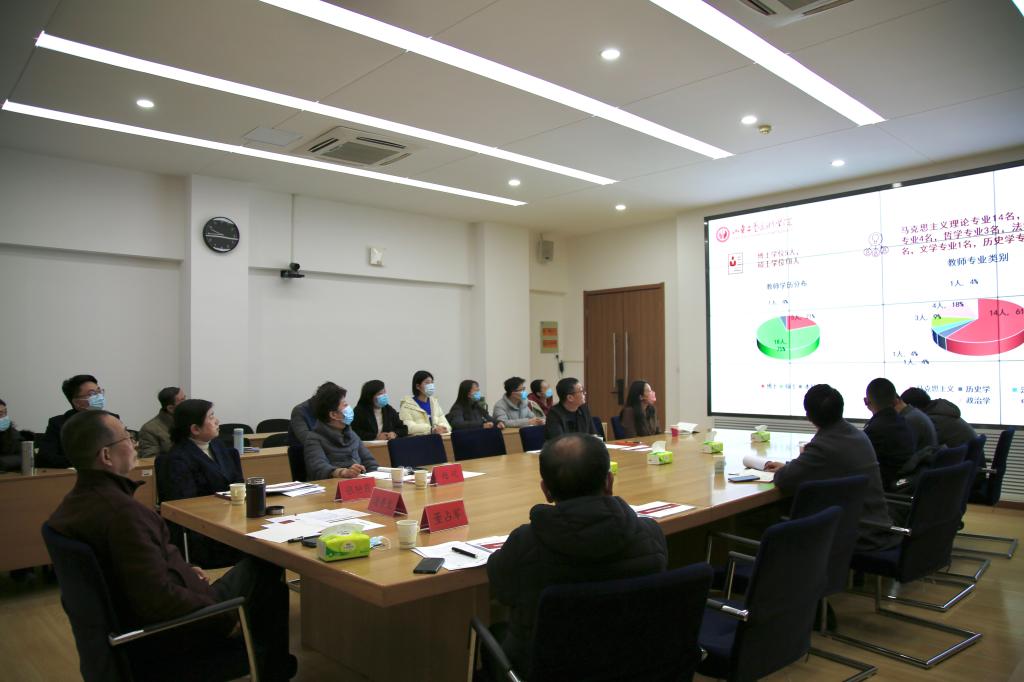 马克思主义学院院长韩文涛从学院概况、工作要点、存在的不足和困难等方面进行汇报。首先,分别从师资力量、科研成果、教研室设置、课程设置等方面对学院概况进行介绍。其次,将工作要点总结为明确工作导向、注重政策引领、紧扣重点工作三个方面,并详细汇报了五项重点工作,分别为:围绕“一条主线”:全面发展,助力学校中心工作;守牢“三大阵地”:主战主责,发挥战斗堡垒作用;加强“三个融合”:融通融合,发挥思政教育效能;推进“两个中心”:守正创新,提高平台育人水平;强化“品牌意识”:立足特色,打造艺术思政标杆。其中,具体提出了“六个一”多元评价体系,与党建工作、学校“大思政”、部门专业融通融合等马院工作新思路、新方法。最后,分别就管理和教研两个方面查摆了学院现存不足和困难。