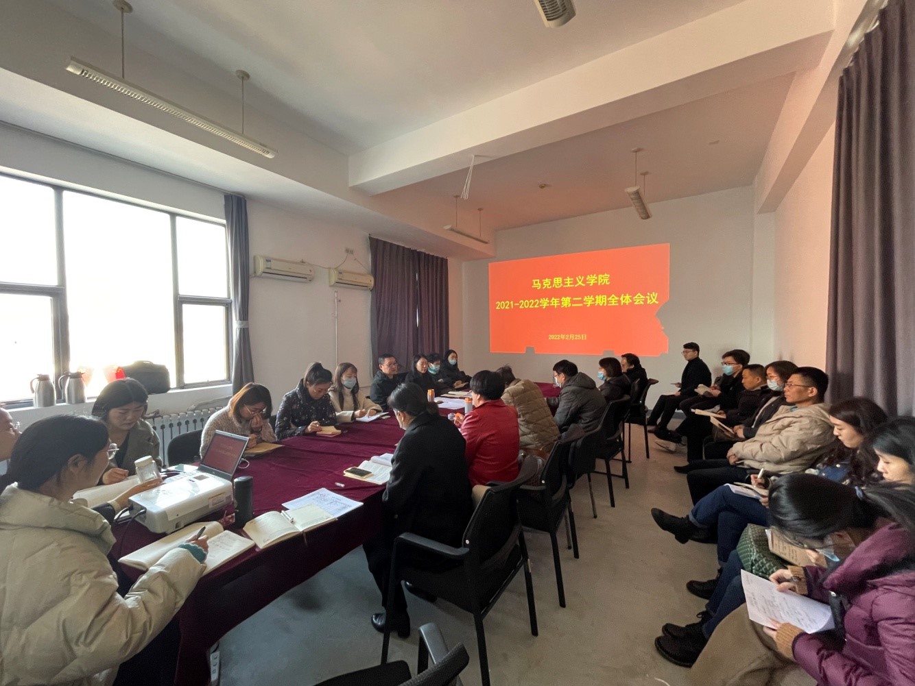 2022年2月25日上午,马克思主义学院全体教师会议在学院会议室召开。会议由院长韩文涛主持,副院长、副书记张晓宁及全体教师参加会议。本次会议是学院党政领导班子调整后召开的第一次大会,围绕总结过去工作和未来进一步推动马克思主义学院建设两个议题展开。