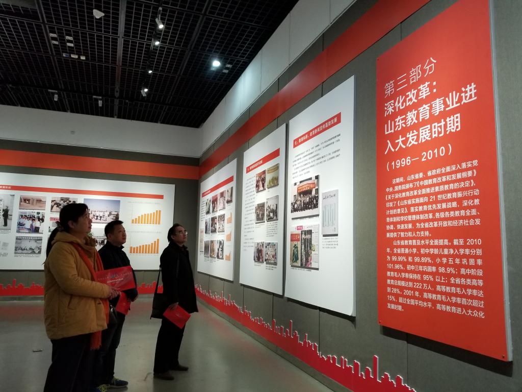 2018年12月16日下午,思政部组织教职工来到山东省博物馆,参观山东教育改革开放40年大型图片展览,系统了解山东省教育改革开放40年来,在基础教育、高等教育和职业教育等方面发生的深刻变化和取得的巨大成就。展览共分为六部分,以“壮阔东方潮,奋进新时代—山东教育改革开放40年”为主题,集中反映了40年来我省教育改革发展的辉煌历程。通过参观展览,教职工更加坚定了对改革开放和中国特色社会主义道路的自信。