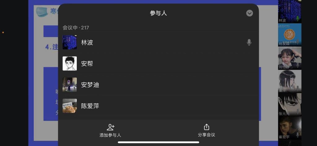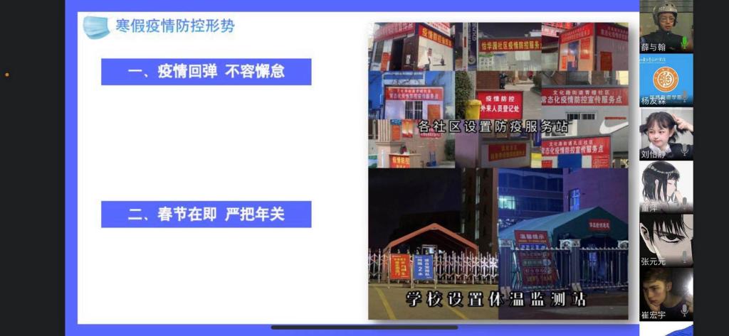 学生会副主席李一凡从“近日最新疫况”、“寒假居家疫情防控生活注意事项”及“疫情中常见心理问题及其应对”三个方面向同学们进行了简要介绍。期间,同学们也积极踊跃的就本地的疫情防控形势、疫情防控措施、疫情防控要求以及自己在疫情防控中做了哪些个人防护进行了交流。从同学们的交流中,可以看出同学们对疫情防控的形势及政策了解的比较到位,有较为清晰的认知和判断。