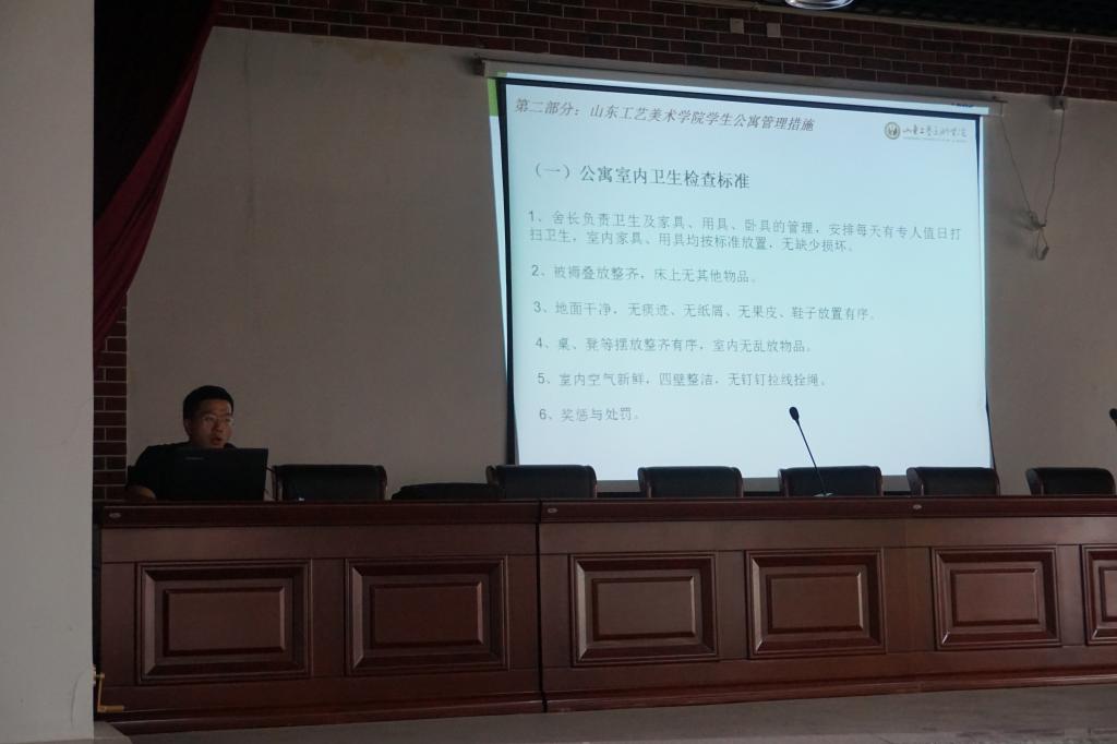 讲座上,杨友森老师从“学生公寓安全制度”、“学生公寓管理措施”、“学生公寓文化建设”、“学生公寓自我管理组织的成立与建设”等四个方面为学生全面讲述了学生公寓的建设。杨老师反复强调了关于违禁电器、饲养宠物、私拉电线网线等违纪行为严重性与危害性,提醒学生们要时刻绷紧一根“安全的弦儿”,要防微杜渐,尽力杜绝一切安全隐患。
