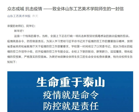 为全力遏制疫情蔓延,确保广大师生员工身体健康及生命安全,学校各部门单位立足岗位,认真履责,严防死守,确保各项防控工作不留死角、落实到位。学校严格落实假期值班制度,要求处级及以上干部无特殊原因尽快返济,驻地待命。建立防控情况联络员日报制度,全面具体掌握师生员工动向和健康状况。制定学生疫情防控工作方案,教育引导学生自觉关注疫情动态,科学规划假期生活。制定延迟开学工作预案,做好招生专业考试延期组织工作预案及开学相关准备工作。组织开展爱国卫生运动,加大校园环境卫生整治力度,推进重点区域和场所环境卫生改善。加强校园门禁管理,实行校门控制性开放,最大限度控制疫情传播风险。