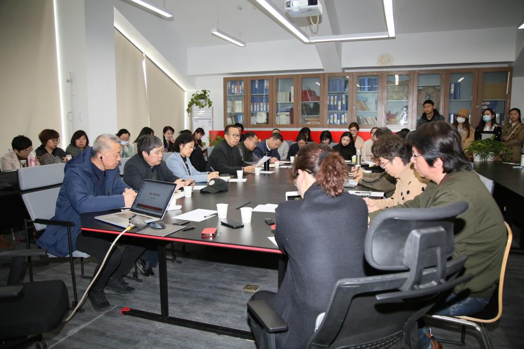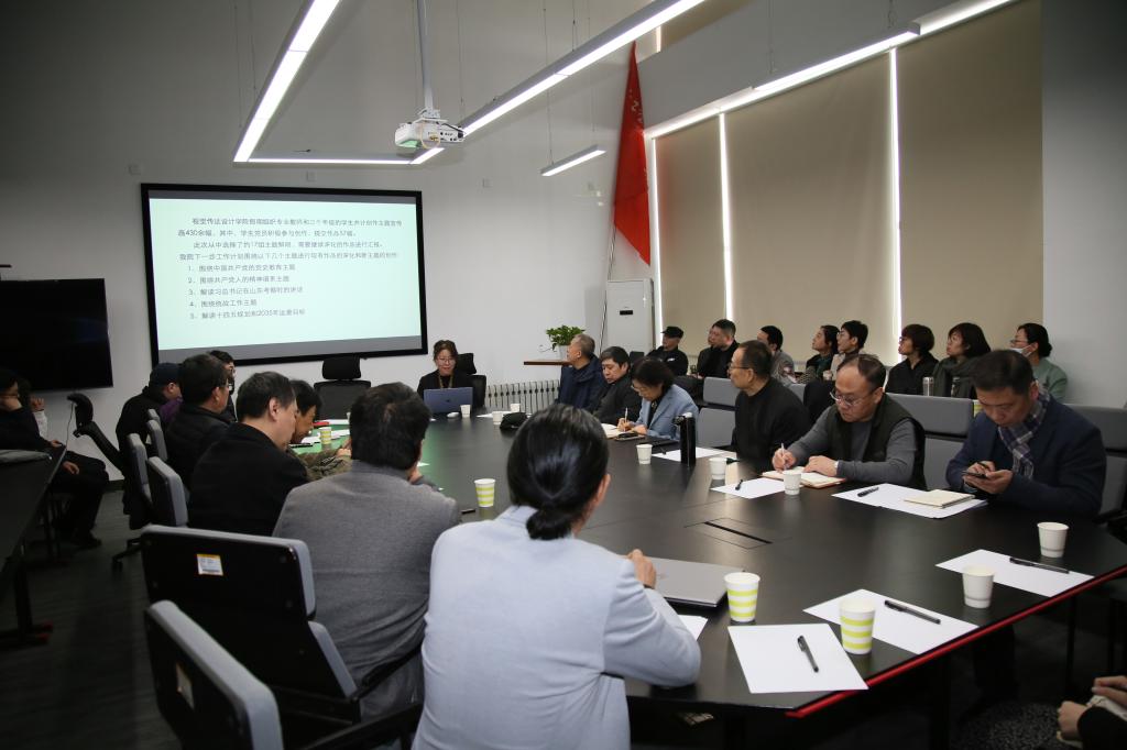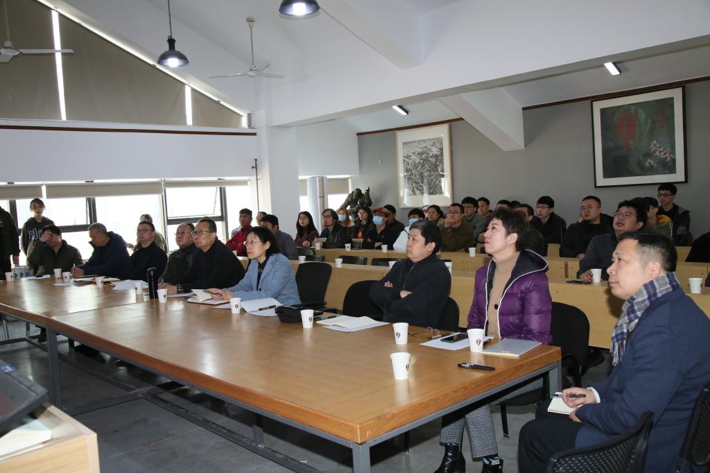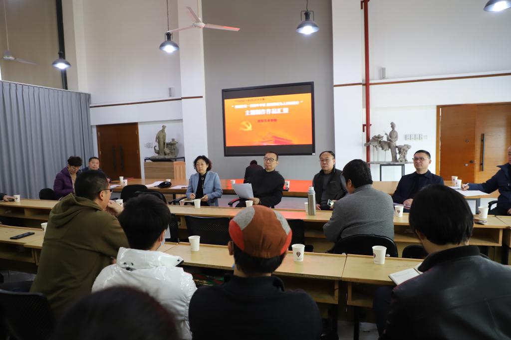 相关教学单位汇报主题创作情况,潘鲁生听取汇报并观摹指导草图创作。潘鲁生表示,从创作情况看,各教学单位精心组织,广泛动员,作品主题明确,题材丰富,体裁多样,艺术语言具有创新性,专业特色鲜明,主题创作取得了积极成效。