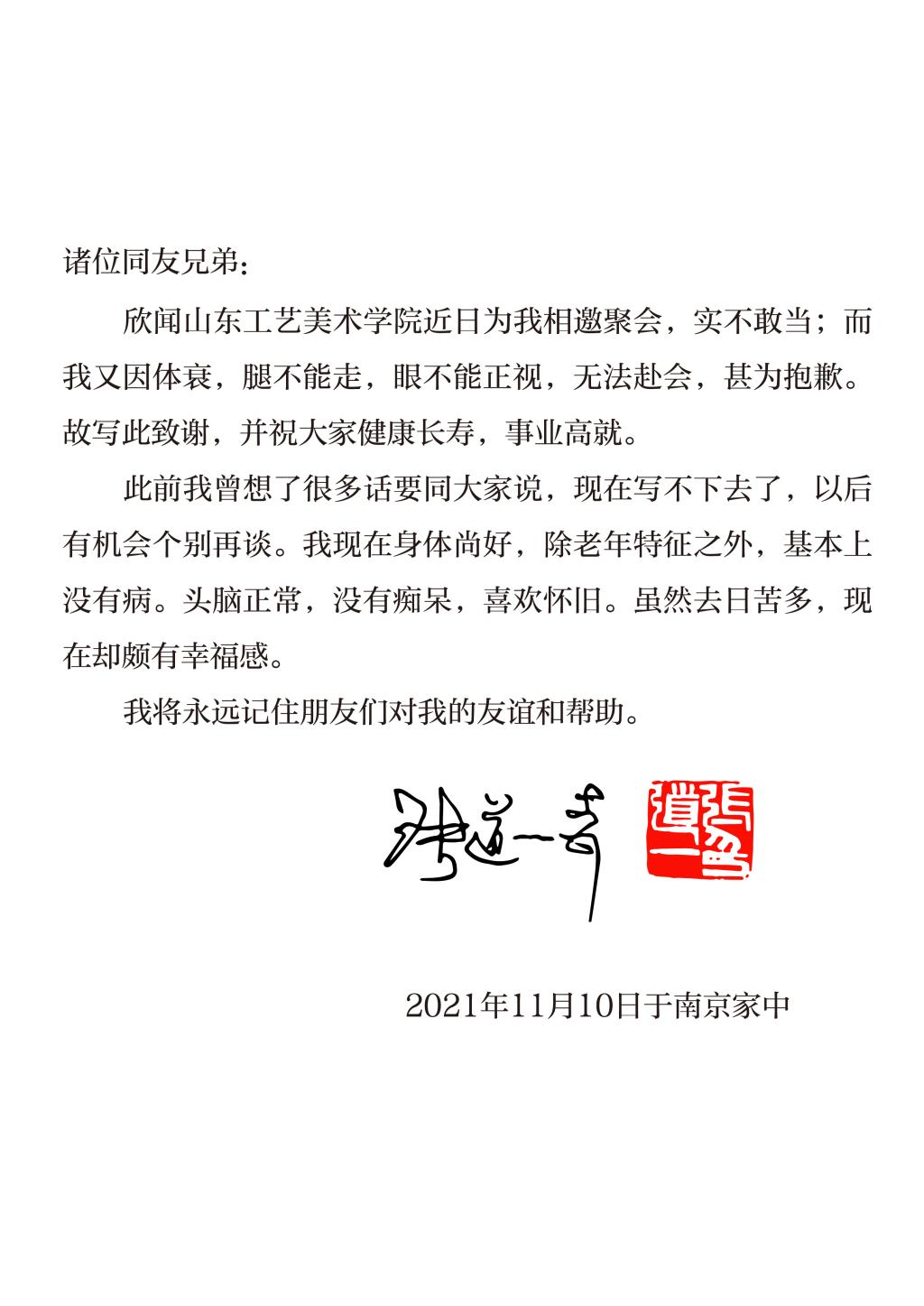 会上,山东省文联副主席王映海宣读中国民间文艺家协会贺信;李新宣读中国文艺评论家协会造型艺术专业委员会主任、中国科学技术大学艺术与科学研究中心主任陈履生贺信;张抒教授宣读张道一先生感谢信;与会嘉宾观看学校专班精心策划和摄制的电视专题片《吾道一以贯之——学者张道一》。