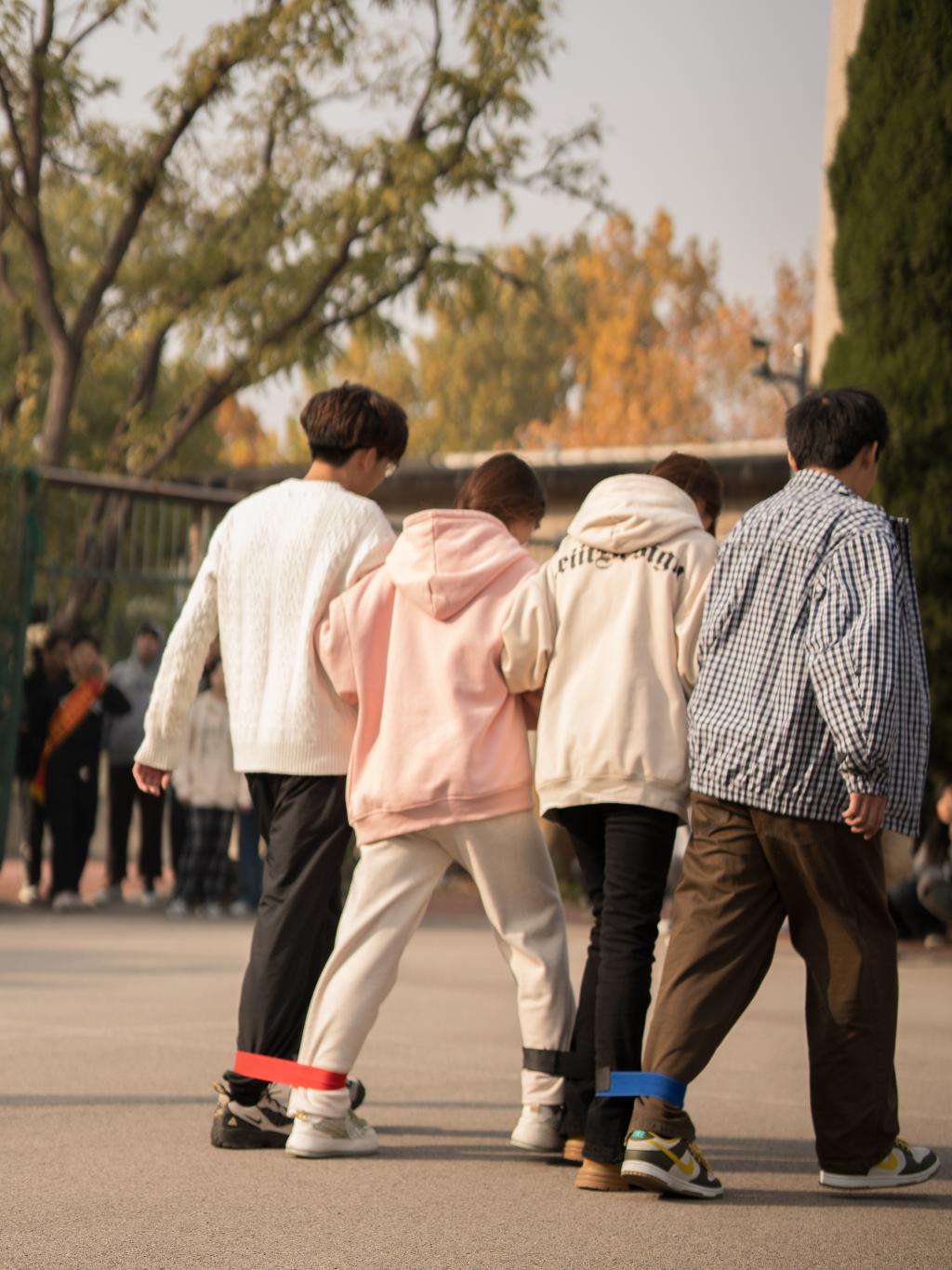 两足相绑,整齐划一,在一声声口号中前进。一心不乱,一段路才能跑的漂亮。提升的不止有速度,还有彼此间的默契。尽管选手们的脚被绑带连起来组合成一双巨脚,却丝毫没有限制他们的行动。他们双手互搭着肩,双腿跟着口号“一二一,一二一”地有序摆动,共同前进。