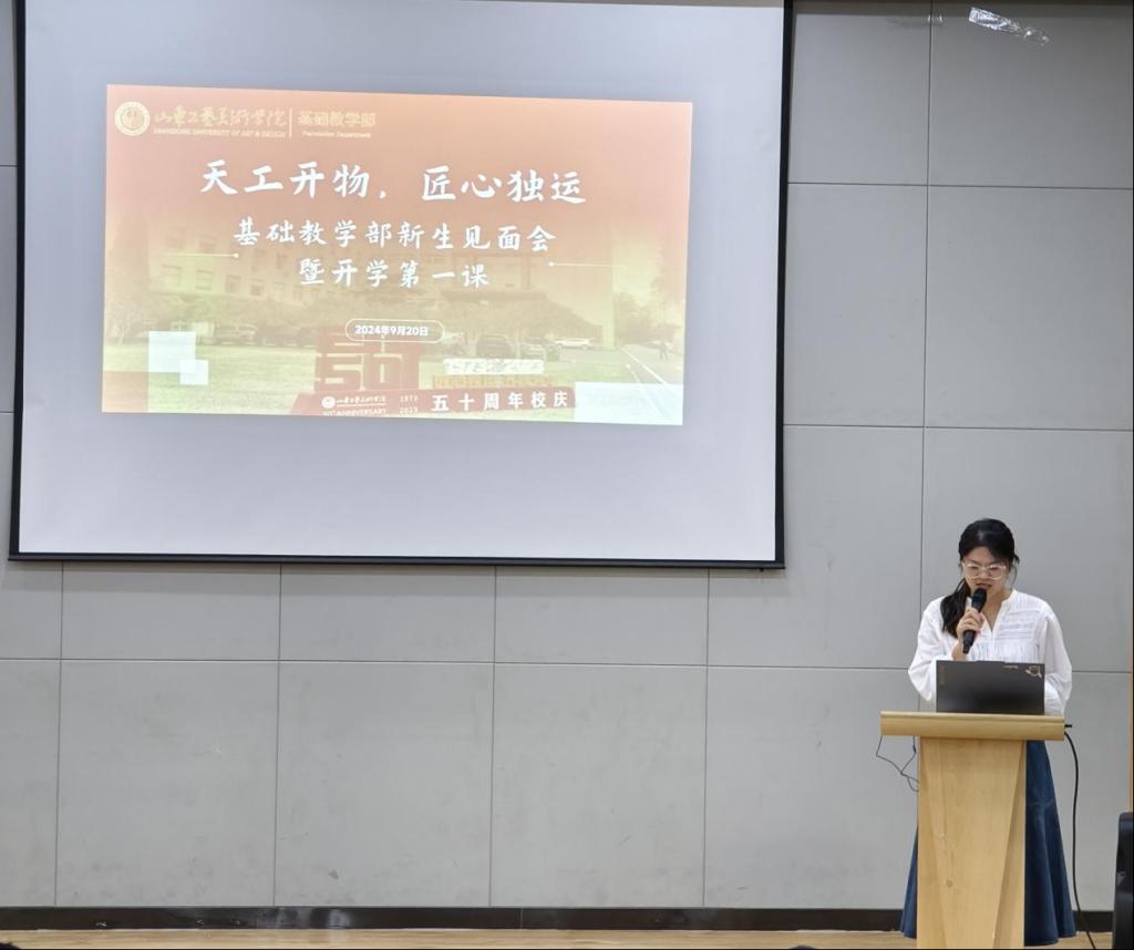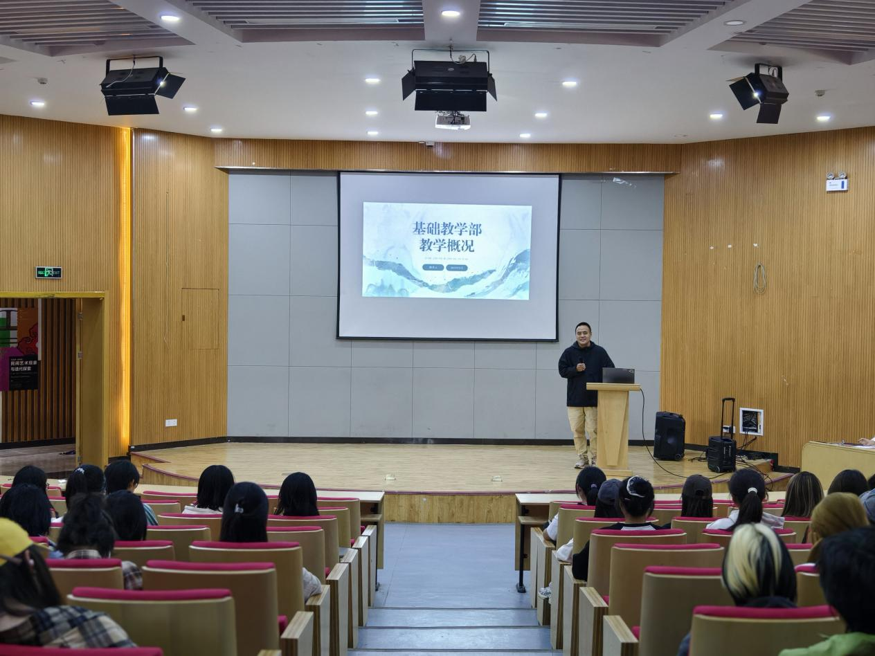 谢其云主任介绍了基础教学部的发展历程,根据“宽口径、厚基础”的要求,重点从学科建设、师资队伍、专业发展、教学任务、教学资源、规章制度、人才培养等方面向新生介绍了基础教学部的基本情况。同时,他对新生提出要求:一、加强道德修养,做到品学兼优;二、研读经典,夯实基础;三、“读万卷书,行万里路”,注重理论与实践的双修。他希望同学们不仅要树立爱祖国、为人民而设计的学习和创作理念,还要积极树立文艺作品传递真善美、传递向上向善的价值观,努力创作无愧于人民和时代的美术与设计作品。