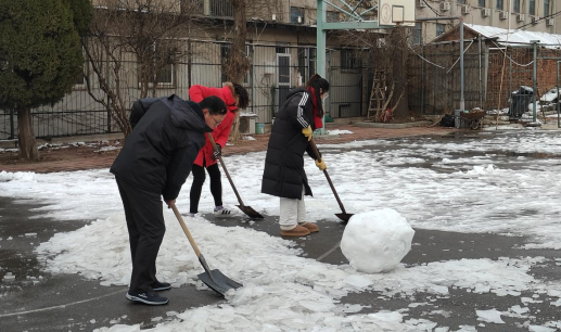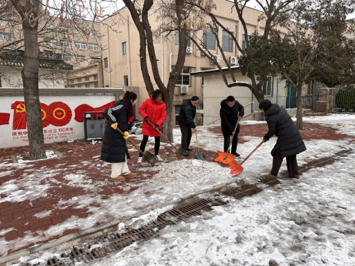 汗水融冰雪,行动践初心。活动中,全体党员不畏寒冷,分工明确,手持推雪板、铁锹等工具,互相配合、团结协作,扫积雪、铲冰层、清杂物、除路障。在全体党员的共同努力下,千佛山校区操场、篮球场的部分积雪迅速清扫到位,用实际行动践行着共产党员的初心和使命,为营造安全、洁净的校园环境贡献一份力量。